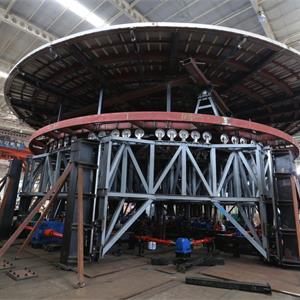 舞臺(tái)升降機(jī)是節(jié)目(秀)的一個(gè)重要布景元素,為單層結(jié)構(gòu),行程: -5.60m至 -3.60m,總行程為2.0m。舞臺(tái)升降機(jī)的頂面將沿著單一軸線從水平位置傾斜10度。整個(gè)頂面可以連續(xù)旋轉(zhuǎn)。升降機(jī)可提供持續(xù)的電源,升降機(jī)下方配備工作照明。所有配電線路在升降機(jī)框架內(nèi)的導(dǎo)管中運(yùn)行。升降機(jī)的頂面為防漏不銹鋼底盤。底盤向中心填充點(diǎn)傾斜 10mm/m;外加8mm的地板表面材料,結(jié)合至 25mm PVC 板材。底盤外緣是一個(gè)連續(xù)的環(huán)形溢流排水口。圍繞舞臺(tái)升降機(jī)是一個(gè)環(huán)形無邊水效果。在周邊平臺(tái)盤中有非吸水性地板材料,坡度也是 12mm/m,與舞臺(tái)升降機(jī)相配。
